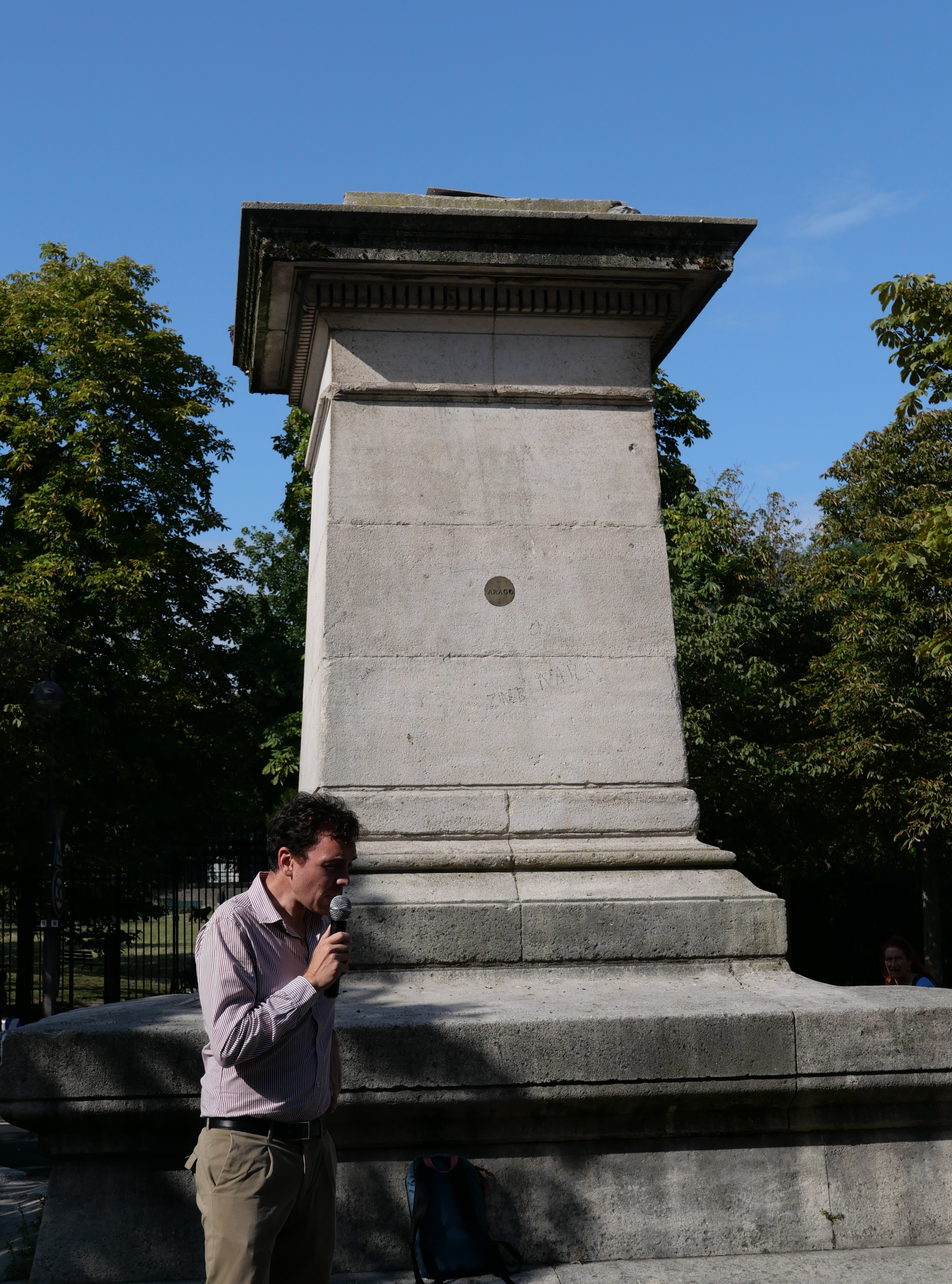 La promenade a débuté sur le boulevard Arago, où Nicolas Benvegnu nous a parlé de François Arago, qui était un astronome, physicien et homme politique français. Nous avons commencé par nous arrêter devant le piédestal de sa statue sur le boulevard. La statue elle-même a été déboulonnée par les Allemands en 1942 pour être fondue et retransformée en armes. Arago a été directeur de l’Observatoire de 1843 à sa mort, dix ans après. Il a beaucoup travaillé sur la cartographie du méridien de Paris, c’est pourquoi on peut trouver 135 médaillons portant son nom sur le tracé du méridien dans la ville.