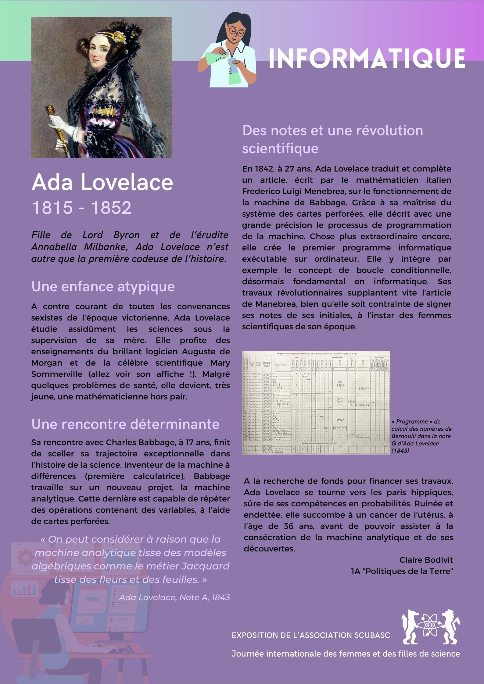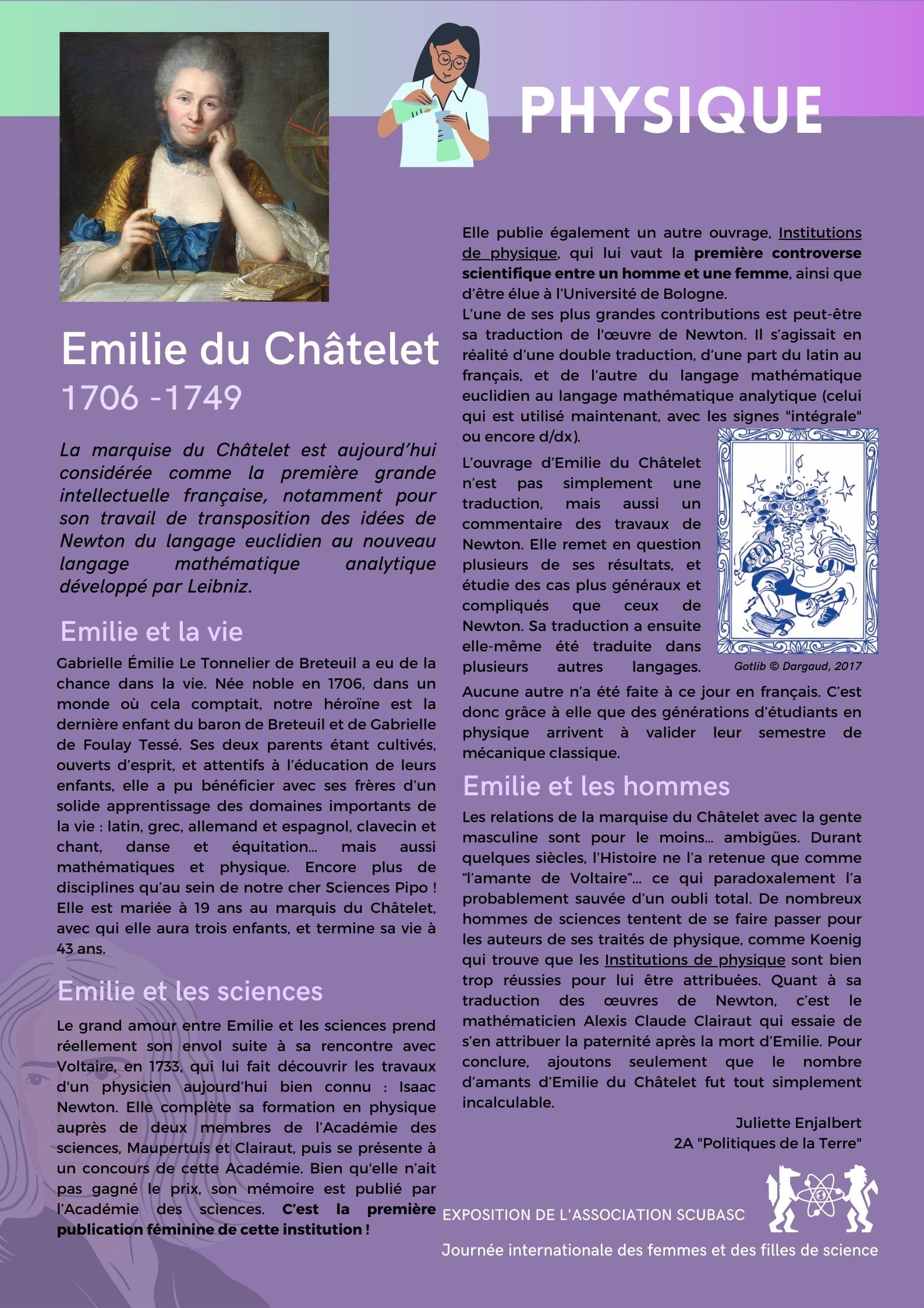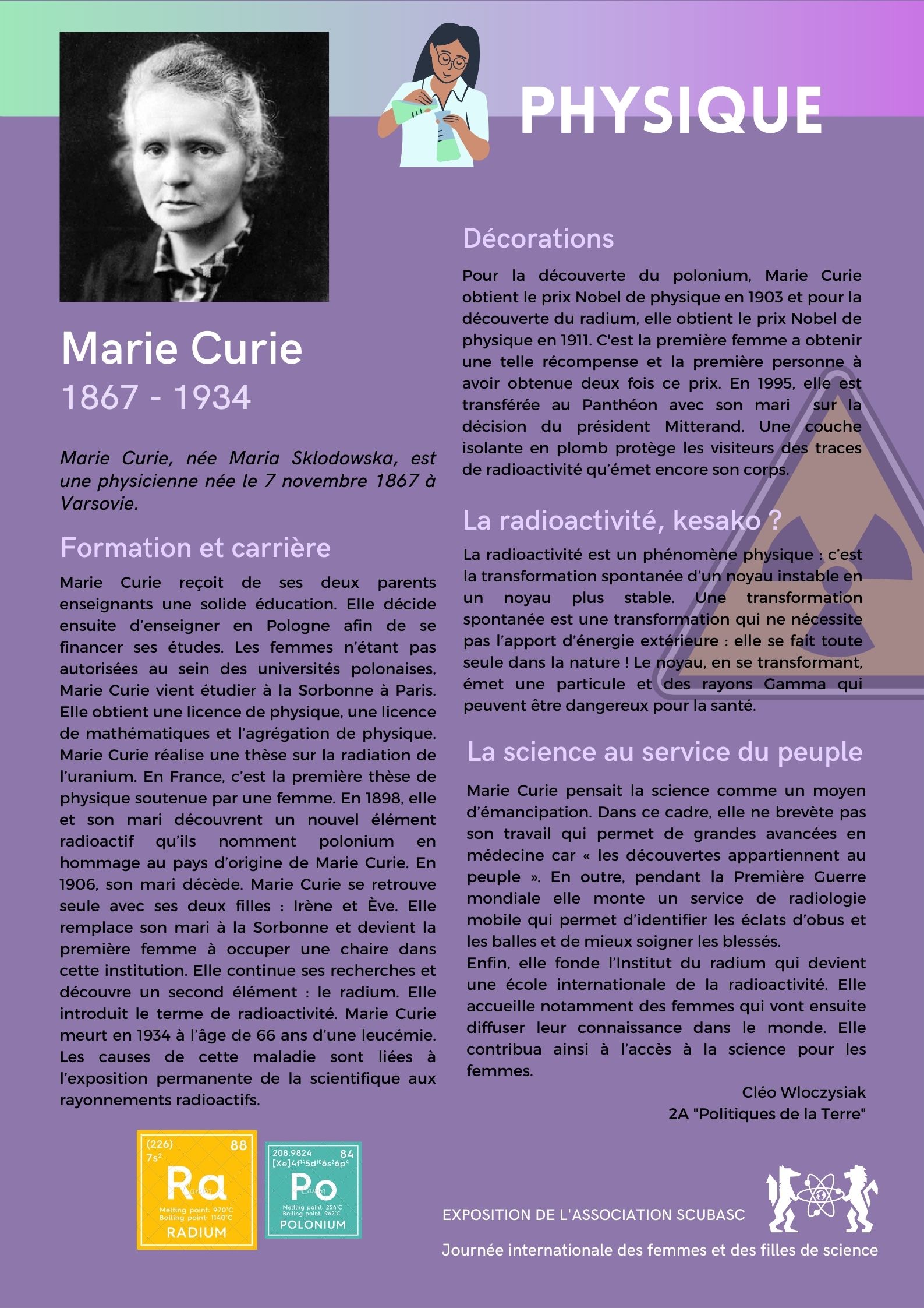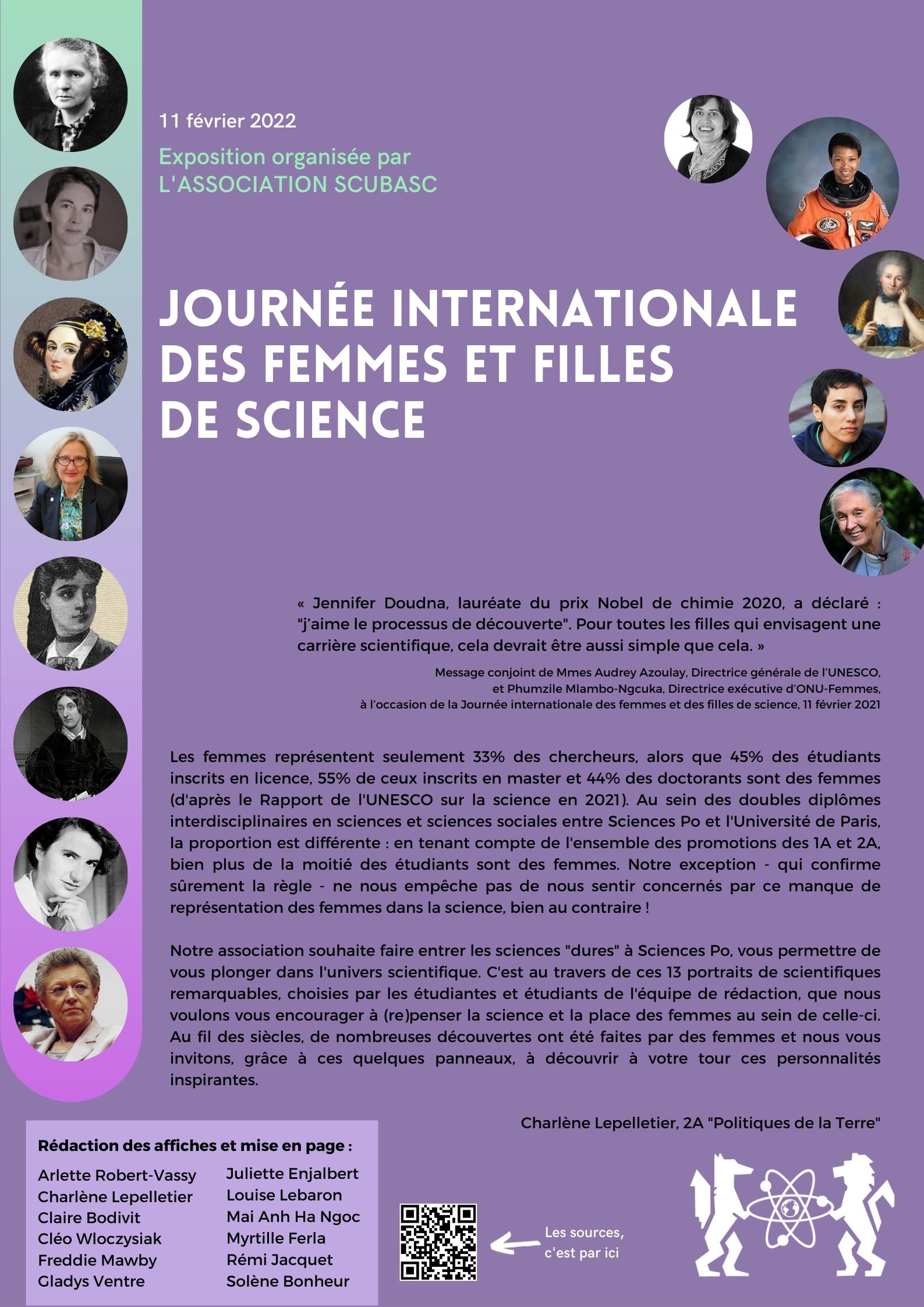 Une équipe d’une douzaine d’étudiantes de de tous parcours et années confondus ont préparé une exposition sur les femmes de sciences, du XVIIe siècle à nos jours. Une série de 15 affiches (voir ci-dessous) était exposée dans le petit hall du 27 rue Saint Guillaume du 11 au 18 février 2022.