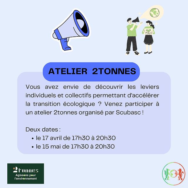 Vous avez envie de découvrir les leviers individuels et collectifs permettant d’accélérer la transition écologique? Venez participer à un atelier 2tonnes organisé par Scubasc ! L’atelier 2tonnes permet d’identifier les leviers d’action climatique sous forme ludique et collective.